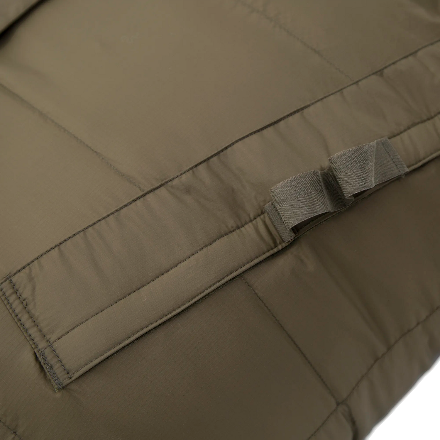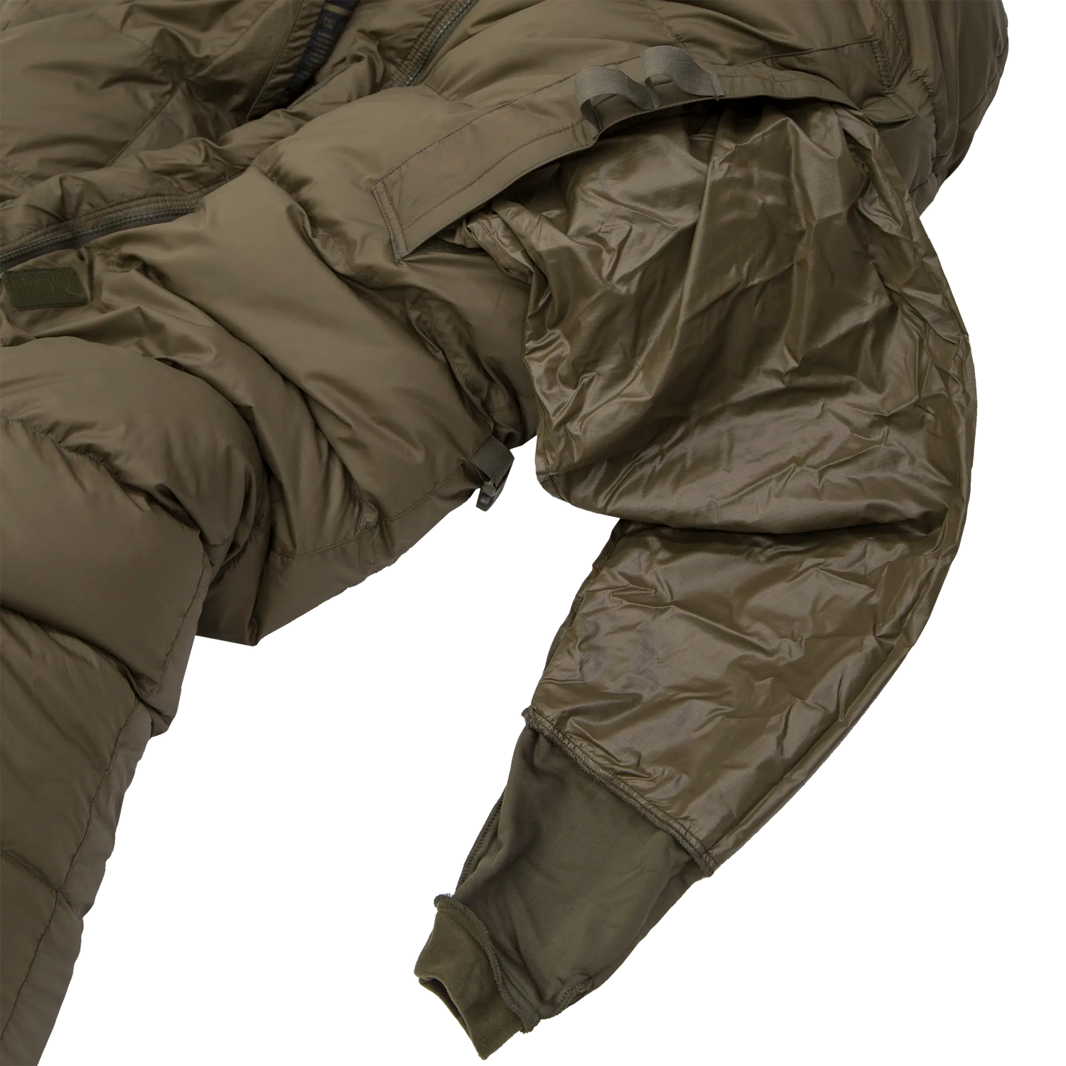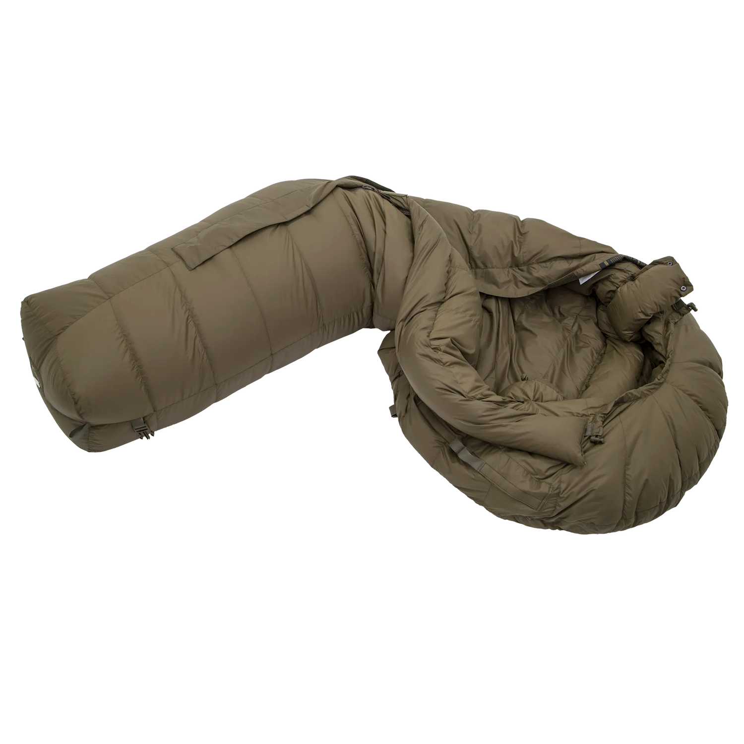 Die vollständig integrierte, vorgeformte Kapuze kann mithilfe einer Zugschnur auf ein kleines Atemloch geschlossen werden, um maximale Wärme zu speichern. Der Schlafsack lässt sich auch als Mantel verwenden: Durch das Öffnen des Reißverschlusses an der Unterseite wird ein schneller Ein- und Ausstieg ermöglicht, während der Fußbereich fixiert werden kann. Die Arme können sicher in der Isolierung verstaut werden.