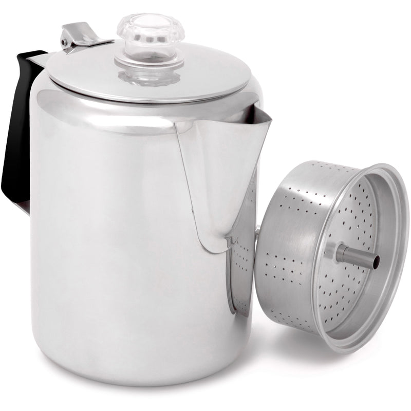 Aus Edelstahl gefertigte Kaffeekanne mit Percolatoreinsatz und durchsichtigem Glasknopf zur Kontrolle des Brauvorgangs.