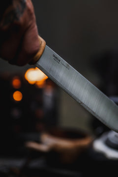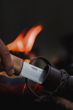 Das Messer sitzt tief in seiner traditionellen Lederscheide, die mit einem Lederriemen befestigt wird. Es ist ein zuverlässiger Begleiter für jedes Camp und bildet zusammen mit einem klassischen kleinen Messer ein unschlagbares Team in Deiner Werkzeugkollektion.