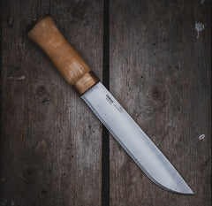 Die Sámi verwenden diese großen Messer, sogenannte Lauku, in ihrem alltäglichen, mobilen Leben. Das Helle Lappland verfügt über eine große, nicht-laminierte Klinge aus 12C27-Edelstahl von Sandvik, die dank ihrer relativ dünnen Form besonders für präzise Schneidarbeiten geeignet ist. Der schlicht gestaltete Griff aus Birkenholz mit Messingbeschlägen liegt gut in der Hand und ist besonders für mittelgroße bis große Hände geeignet.