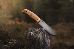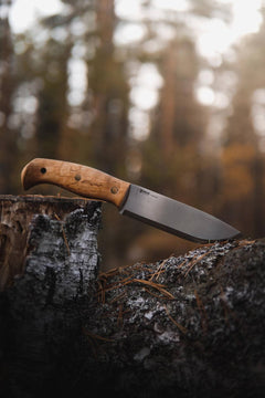 Der Griff aus maserbirke liegt sicher und angenehm in der Hand und verleiht dem Messer eine warme natürliche Optik. Die Full Tang Konstruktion sorgt für maximale Stabilität auch bei härterem Einsatz. Geliefert wird das Messer mit einer hochwertigen Lederscheide für sicheren Transport.