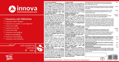 Zutaten: Couscous 67% (Hartweizengrieß), Hühnerfleisch 12%, Würzmischung (enthält Sellerie), Erbsen geschrotet, Zwiebeln, Sonnenblumenölpulver (enthält Milch, E551), modifizierte Stärke, Salz,