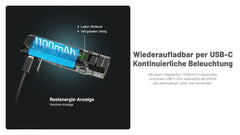 Der integrierte Li Ion Akku mit 1100 mAh wird bequem über USB C geladen und ermöglicht eine maximale Laufzeit von bis zu 250 Stunden im Ultralow Modus.