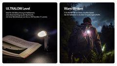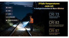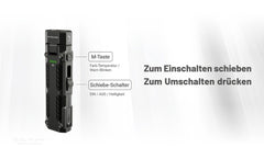 Die Bedienung erfolgt intuitiv über einen seitlichen Schiebe Schalter für die Leuchtstufen sowie einen separaten Mode Knopf zum Wechsel der Lichtfarbe. Zusätzlich steht ein Ultralow Modus mit 1 Lumen zur Verfügung ideal für lange Laufzeiten oder diskrete Beleuchtung.