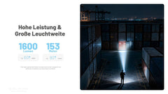 Zwei leistungsstarke Quad Core MCT UHE LEDs liefern eine maximale Lichtleistung von bis zu 1600 Lumen bei einer Reichweite von bis zu 153 Metern. Die Lampe bietet drei wählbare Lichtfarben Cool White Neutral White und Warm White und deckt damit ein breites Spektrum an Anwendungen ab von präziser Ausleuchtung bis zu augenschonendem Licht.